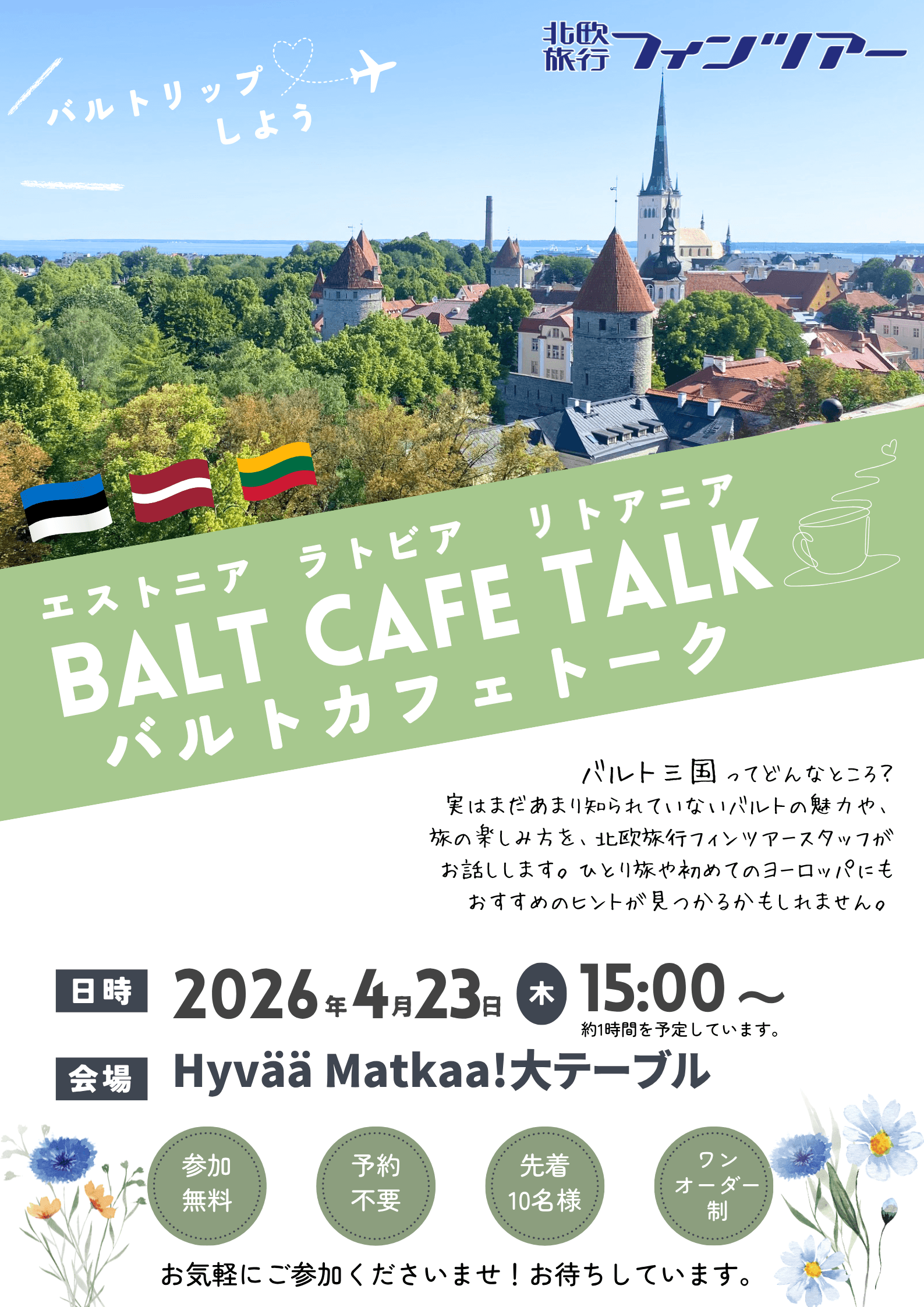 北欧旅行フィンツアーでは、下記の日程にて「バルトカフェトーク」を開催いたします。