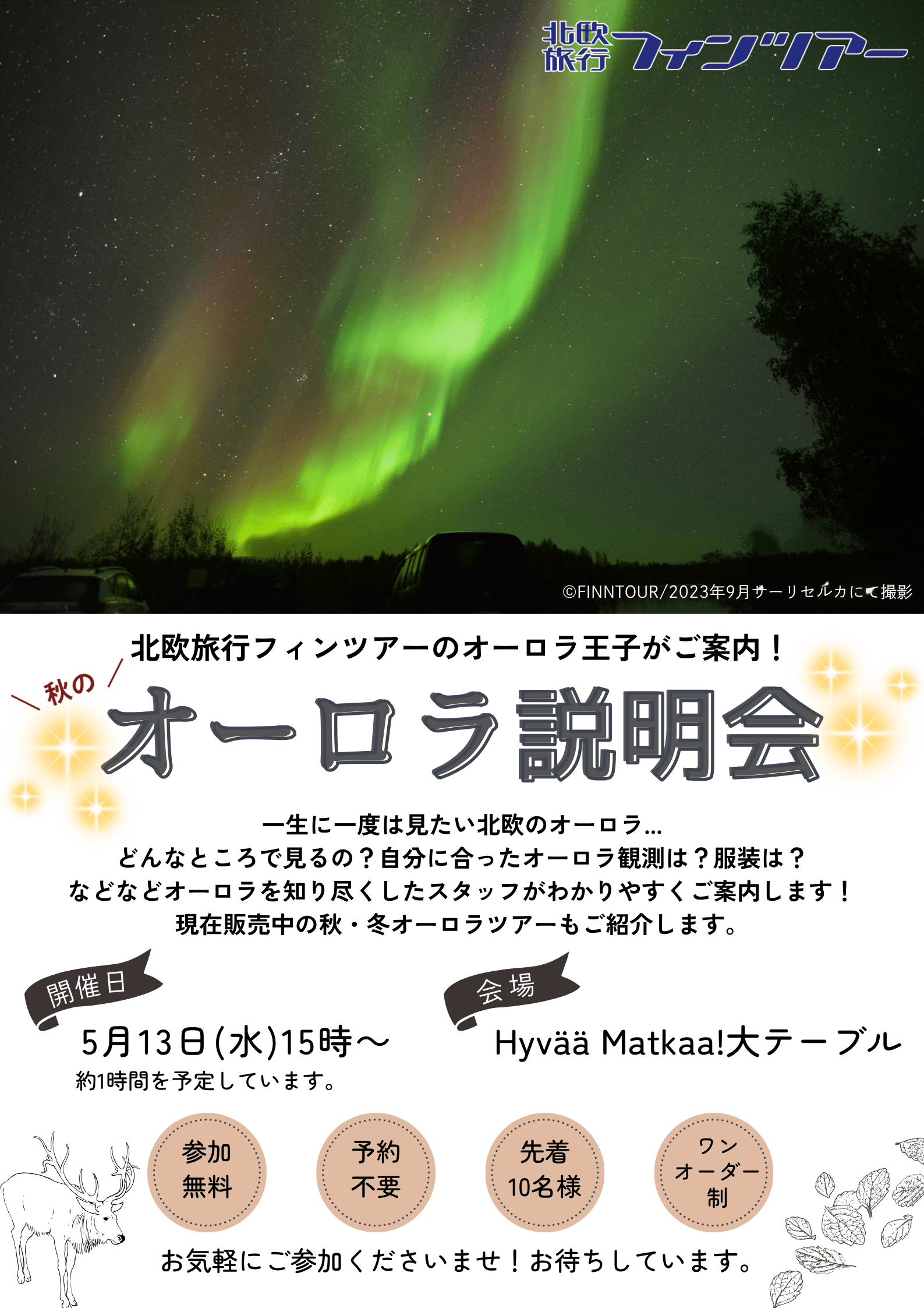 北欧旅行フィンツアーでは、下記の日程にて「秋のオーロラツアー説明会」を開催いたします。