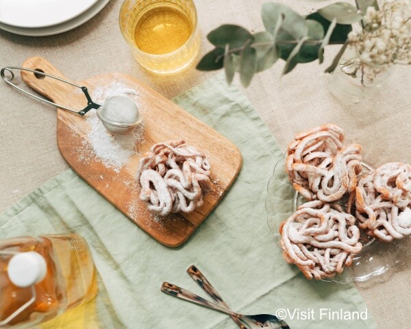 ヴァップに欠かせない飲み物は「シマ sima」という飲み物。レモン、レーズン、はちみつの入った微炭酸でさわやかな味です。また「ティッパレイパ tippaleipä」というお菓子もこの時期に食べるのが定番です。